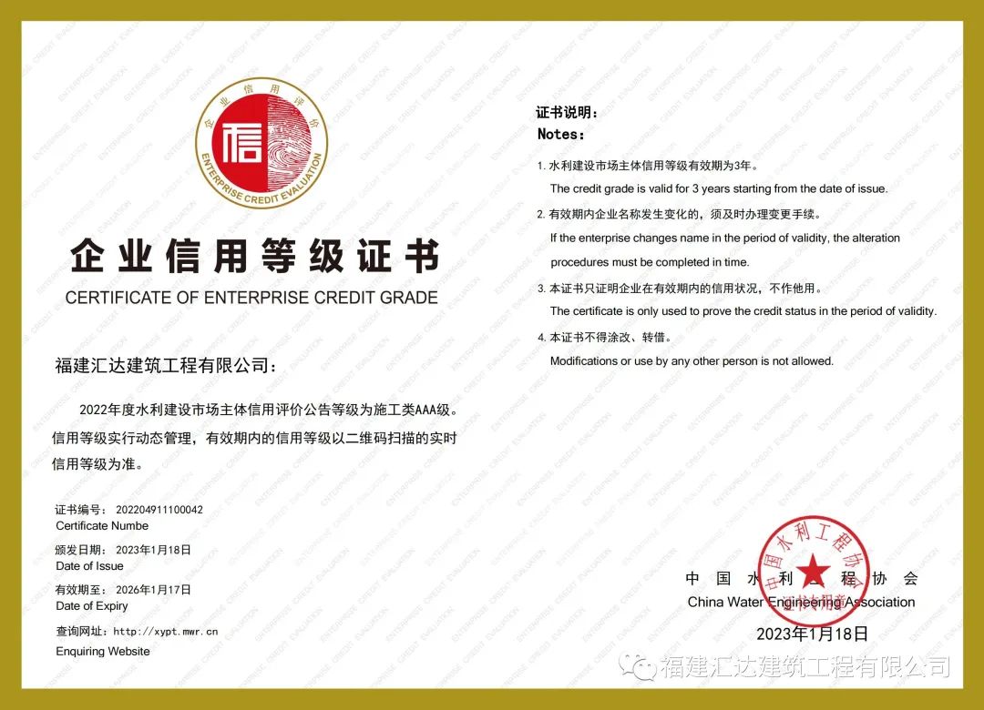 新利(中国)官方在2022年度水利建设市场主体信用评价公告等级为施工类AAA级